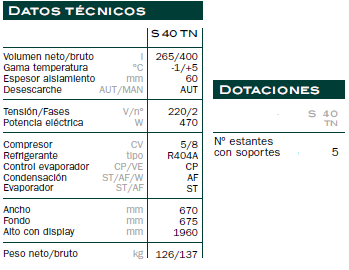 Armario expositor refrigerado 1 cara cristal TORNADOS40TN. Dimensiones: 670 x 675 x 1960mm. Armarios expositores de gran capacidad y con una amplia superficie acristalada favoreciendo enormemente la visibilidad del producto. Puertas con amplia superficie acristalada de alto aislamiento y resistencias antivaho que eliminan rápidamente la condensación producida por aperturas de puerta. Sistema frigorífico potenciado para conseguir mantener la temperatura estable en condiciones de servicio intensivo. Estantes metálicos de construcción robusta que permiten una elevada capacidad de carga por cada nivel de exposición. Doble tubo fluorescente que proporciona una iluminación uniformea lo largo de toda el área de exposición. Modelo S 40 TN estatico lleva ventilador en el evaporador parauna temperatura uniforme. Estantes regulables en altura para el modelo conservación y fijos para el modelo congelación. Ruedas unidireccionales de serie.